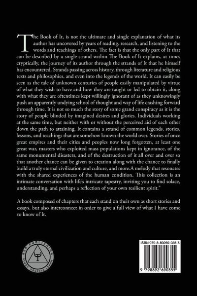 The Book of It, is not the ultimate and single explanation of what its author has uncovered by years of reading, research, and listening to the words and teachings of others. The fact is that the only part of It that can be described by a single strand within The Book of It explains, at times cryptically, the journey of its author through the strands of It that he himself has encountered. Strands passing across history, through literature and religious texts and philosophies, and even into the legends of the world. It can easily be seen as the tale of unknown centuries of people easily manipulated by virtue of what they wish to have and how they are taught or led to obtain it, along with what they are oftentimes kept willingly ignorant of as they unknowingly push an apparently undying school of thought and way of life crashing forward through time. It is not so much the story of some grand conspiracy as it is the story of people blinded by imagined desires and glories. Individuals working at the same time, but neither with or without the perceived aid of each other down the path to attaining. It contains a strand of common legends, stories, lessons, and teachings that are somehow known the world over. Stories of once great empires and their cities and peoples now long forgotten, at least one great war, masters who exploited mass populations kept in ignorance, of the same monumental disasters, and of the destruction of it all over and over so that another chance can be given to creation along with the chance to finally build a truly eternal civilization and culture, and more. A melody that resonates with the shared experiences of the human condition. This collection is an intimate conversation with life's intricate tapestry, inviting you to find solace, understanding, and perhaps a reflection of your own resilient spirit." A book composed of chapters that each stand on their own as short stories and essays, but also interconnect in order to give a full view of what I have come to know of It.