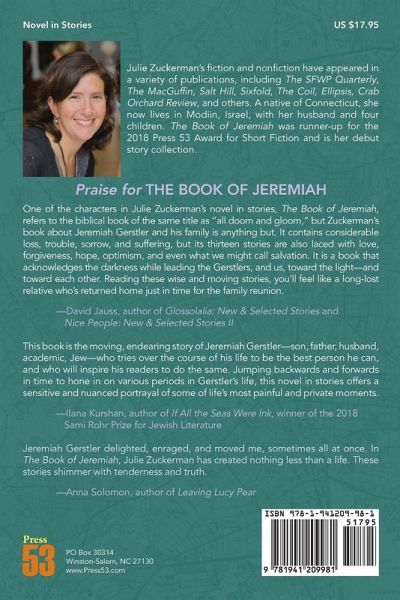 Julie Zuckerman's moving and engrossing debut novel-in-stories, The Book of Jeremiah, tells the story of awkward but endearing Jeremiah Gerstler -- the son of Jewish immigrants, brilliant political science professor, husband, father. Jeremiah has yearned for respect and acceptance his entire life, and no matter his success, he still strives for more. As a boy, he was feisty and irreverent and constantly compared to his sweet and well-behaved older brother, Lenny. At the university, he worries he is a token hire. Occasionally, he's combative with colleagues, especially as he ages. But there is a sweetness to Gerstler, too, and an abiding loyalty and affection for those he loves. When he can overcome his worst impulses, his moments of humility become among the best measures of his achievements. Spanning eight decades and interwoven with the Jewish experience of the 20th century, Julie Zuckerman charts Jeremiah's life from boyhood, through service in WWII, to marriage and children, a professorship and finally retirement, with compassion, honesty, and a respect that even Gerstler himself would find touching.
