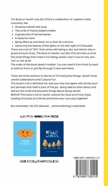 The Book of Jewish Joys (No OYs) is a celebration of Judaism's little moments, like:Slurping matzah ball soup The smell of freshly baked challah A gooey bite of Hamentashen A really fun hora Being lifted up and down on a chair at a simcha Savouring the beauty of the lights on the last night of Chanukah There are a lot of "OYs" that come with being a Jew, but there's also a great amount of joy. The Book of Jewish Joys (No OYs) reminds us of all the small things that make it fun being Jewish, even if you're only Jew - "ish" or not at all. The order of the book doesn't matter. You can read it from front to back or back to front or just flip through it here and there. There are three sections to the list of 72 small joyful things: Jewish Food, Jewish Celebrations and Cultural Fun. This book is not a definitive list, and you may not agree with all the 'joys'- but perhaps that itself is part of the joy- being able to think about and discuss the small and beautiful things about being Jewish. BONUS! This book is full of Jewish cultural fun facts and trivia. Enjoy reading this book as a family and share your own joys together! But remember: No OYs allowed ... some kvetching is tolerated.