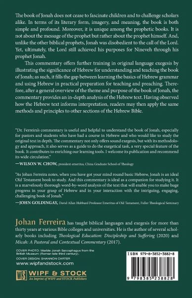 The book of Jonah does not cease to fascinate children and to challenge scholars alike. In terms of its literary form, imagery, and meaning, the book is both simple and profound. Moreover, it is unique among the prophetic books. It is not about the message of the prophet but rather about the prophet himself. And, unlike the other biblical prophets, Jonah was disobedient to the call of the Lord. Yet, ultimately, the Lord still achieved his purposes for Nineveh through his prophet Jonah. This commentary offers further training in original language exegesis by illustrating the significance of Hebrew for understanding and teaching the book of Jonah; as such, it fills the gap between learning the basics of Hebrew grammar and using Hebrew in practical preparation for teaching and preaching. Therefore, after a general overview of the theme and purpose of the book of Jonah, the commentary provides an in-depth analysis of the Hebrew text. Having observed how the Hebrew text informs interpretation, readers may then apply the same methods and principles to other sections of the Hebrew Bible.