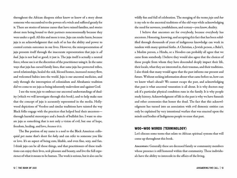 Juju Bae is a practitioner of multiple West African and diasporic traditions, including Ifa and Hoodoo Conjure, and is an ¿¿un priestess in the Orisha tradition. She is the founder of Juju Bae, a multimedia Black-centric resource that seeks to demystify the Black occult through storytelling interviews and lighthearted conversations with twenty-first-century relevance. She is the host of the acclaimed A Little Juju podcast, which encourages Black people to find a home in Africana spiritual spaces and thought, and has starred in the Hulu docuseries Living for the Dead. She helps people, young and old, to remember that we have the tools and guidance with us as we journey through this lifetime. Juju is a sought-after spiritual teacher who loves to sing and holds a BA in psychology from Spelman College. She lives in Brooklyn, NY.