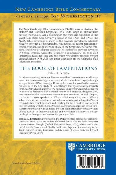 Other commentaries see Lamentations' theological positions as randomly expressed. In this commentary, we discover how Lamentations' narrator, a pastoral mentor, engages daughter Zion in a series of discussions in a systematic process akin to therapy, charting for her a way forward to reconnecting with the Lord.