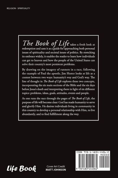 The Book of Life takes a fresh look at redemption and uses it as a guide for approaching both personal issues of spirituality and societal issues of politics. By stretching its embrace widely, it enables the reader to learn how individuals can get to heaven and how the people of the United States can solve their country's most persistent problems. By drawing on the imagery of runners in a race, following the example of Paul the apostle, Jim Hester looks at life as a contest between two ways: humanity's way and God's way. The line of thought in The Book of Life explores these two concepts, incorporating the six main sections of the Bible and the six days before Jesus's death and interpreting them in light of six different topics: problems, ideas, goals, attitudes, events and people.