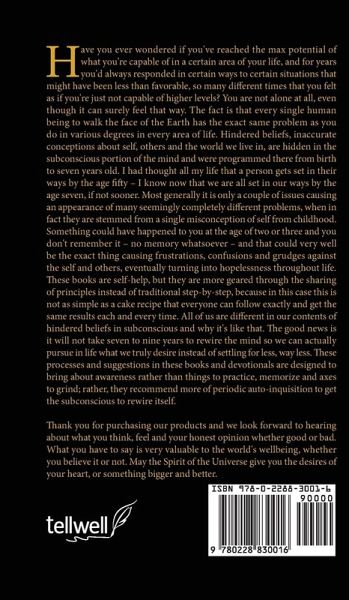 Have you ever wondered if you've reached the max potential of what you're capable of in a certain area of your life, and for years you'd always responded in certain ways to certain situations that might have been less than favorable, so many different times that you felt as if you're just not capable of higher levels? You are not alone at all, even though it can surely feel that way. The fact is that every single human being to walk the face of the Earth has the exact same problem as you do in various degrees in every area of life. Hindered beliefs, inaccurate conceptions about self, others and the world we live in, are hidden in the subconscious portion of the mind and were programmed there from birth to seven years old. I had thought all my life that a person gets set in their ways by the age fifty - I know now that we are all set in our ways by the age seven, if not sooner. Most generally it is only a couple of issues causing an appearance of many seemingly completely different problems, when in fact they are stemmed from a single misconception of self from childhood. Something could have happened to you at the age of two or three and you don't remember it - no memory whatsoever - and that could very well be the exact thing causing frustrations, confusions and grudges against the self and others, eventually turning into hopelessness throughout life. These books are self-help, but they are more geared through the sharing of principles instead of traditional step-by-step, because in this case this is not as simple as a cake recipe that everyone can follow exactly and get the same results each and every time. All of us are different in our contents of hindered beliefs in subconscious and why it's like that. The good news is it will not take seven to nine years to rewire the mind so we can actually pursue in life what we truly desire instead of settling for less, way less. These processes and suggestions in these books and devotionals are designed to bring about awareness rather than things to practice, memorize and axes to grind; rather, they recommend more of periodic auto-inquisition to get the subconscious to rewire itself. Thank you for purchasing our products and we look forward to hearing about what you think, feel and your honest opinion whether good or bad. What you have to say is very valuable to the world's wellbeing, whether you believe it or not. May the Spirit of the Universe give you the desires of your heart, or something bigger and better.