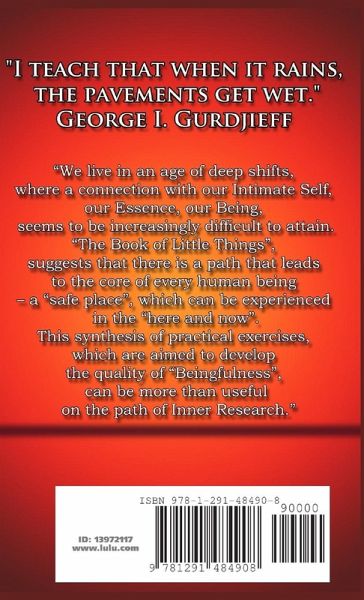 "We live in an age of deep shifts, where a connection with our Intimate Self, our Essence, our Being, seems to be increasingly difficult to attain. "The Book of Little Things", suggests that there is a path that leads to the core of every human being - a "safe place", which can be experienced in the "here and now". This synthesis of practical exercises, which are aimed to develop the quality of "Beingfulness", can be more than useful on the path of Inner Research." A 100%% practical book