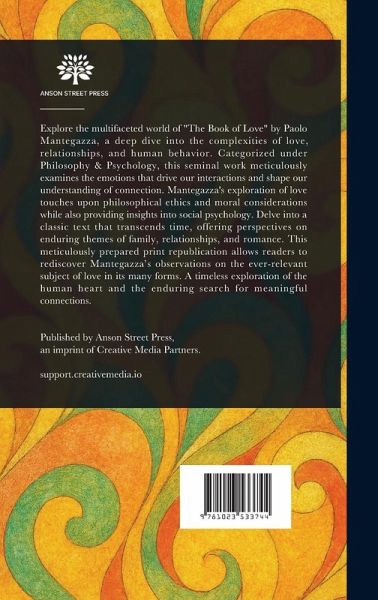 Explore the multifaceted world of "The Book of Love" by Paolo Mantegazza, a deep dive into the complexities of love, relationships, and human behavior. Categorized under Philosophy & Psychology, this seminal work meticulously examines the emotions that drive our interactions and shape our understanding of connection. Mantegazza's exploration of love touches upon philosophical ethics and moral considerations while also providing insights into social psychology. Delve into a classic text that transcends time, offering perspectives on enduring themes of family, relationships, and romance. This meticulously prepared print republication allows readers to rediscover Mantegazza's observations on the ever-relevant subject of love in its many forms. A timeless exploration of the human heart and the enduring search for meaningful connections. This work has been selected by scholars as being culturally important, and is part of the knowledge base of civilization as we know it. This work is in the public domain in the United States of America, and possibly other nations. Within the United States, you may freely copy and distribute this work, as no entity (individual or corporate) has a copyright on the body of the work. Scholars believe, and we concur, that this work is important enough to be preserved, reproduced, and made generally available to the public. We appreciate your support of the preservation process, and thank you for being an important part of keeping this knowledge alive and relevant.