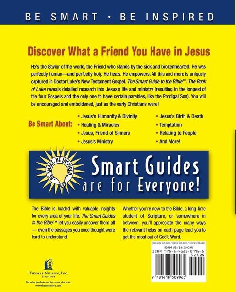Discover What a Friend You Have in Jesus He's the Savior of the world, the Friend who stands by the sick and brokenhearted. He was perfectly human-and perfectly holy. He heals and empowers. All this and more is uniquely captured in Luke's New Testament Gospel. The Smart Guide to the Bible: The Book of Luke takes you verse-by-verse through Jesus' life and ministry. You will be encouraged and emboldened, just as the early Christians were. The Smart Guide to the Bible is a series of simplified commentaries designed to uncomplicate God's word for everyday Bible readers. Every page contains handy features or learning aids like these: cross-references to other Scriptures brief commentaries from experts points to ponder the big picture of how passages fit with the entire Bible practical tips for applying biblical truths to life simple definitions of key words and concepts interesting maps, charts, and illustrations wrap-ups of each biblical passage study questions Whether you're new to the Bible, a long-time student of Scripture, or somewhere in between, you'll appreciate the many ways The Smart Guide to the Bible: The Book of Luke goes far beyond your typical Bible study tool. The practical, relevant helps on each page lead you to get the most out of God's word.