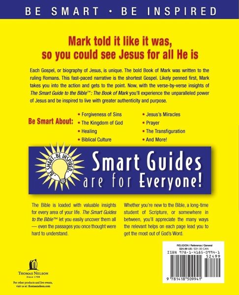 Mark told it like it was so you could see Jesus as He is. Each Gospel, or biography of Jesus, is unique. Likely penned first, Mark's fast-paced narrative takes you into the action and gets to the point. With the verse-by-verse insights in The Smart Guide to the Bible: The Book of Mark, you'll experience the unparalleled power of Jesus and be inspired to live with greater authenticity and purpose. The Smart Guide to the Bible is a series of simplified commentaries designed to uncomplicate God's word for everyday Bible readers. Every page contains handy features or learning aids like these: cross-references to other Scriptures brief commentaries from experts points to ponder the big picture of how passages fit with the entire Bible practical tips for applying biblical truths to life simple definitions of key words and concepts interesting maps, charts, and illustrations wrap-ups of each biblical passage study questions Whether you're new to the Bible, a long-time student of Scripture, or somewhere in between, you'll appreciate the many ways The Smart Guide to the Bible: The Book of Mark goes far beyond your typical Bible study tool. The practical, relevant helps on each page lead you to get the most out of God's word.
