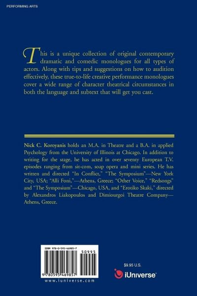 This is a unique collection of original contemporary dramatic and comedic monologues for all types of actors. Along with tips and suggestions on how to audition effectively, these true-to-life creative performance monologues cover a wide range of character theatrical circumstances in both the language and subtext that will get you cast.