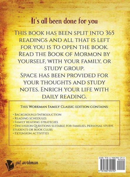 This Workman Family Classic edition contains: • Background/Introduction • Reading schedules • Family reading strategies • Extension activities This book has been split into 365 readings and all that is left for you is to open the book and get started! Read the Book of Mormon by yourself, with your family, or study group. Space has been provided for your thoughts and study notes. Enrich your life with daily reading.