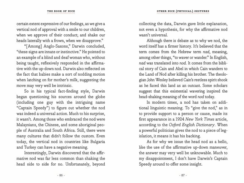 A perfect "pick me up" book, THE BOOK OF NICE is an obsessive and wide-ranging collection of essays, timelines, charts, and lists about the origins of all things nice - from why we smile or give standing ovations to the story behind why we say please and thank you and hello and goodbye. Written by an award-winning journalist, THE BOOK OF NICE delves into the origins of 82 seemingly small "nice" gestures, symbols, and phrases and argues convincingly that they are what make the world go 'round.