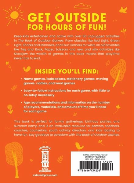 Keeping your kids entertained and active just became a lot easier with over 50 unplugged activities in The Big Book of Outdoor Games. Encourage your kids to get outside for hours of fun. Build outdoor forts, create obstacle courses, or try out new jump rope games. Kids will enjoy throwbacks to old classics like Red Light, Green Light, dodgeball, Capture the Flag, Freeze Tag, Monkey in the Middle, and more. With safety tips and recommendations for modifying games for players with different abilities, playtime can be safe and fun for everyone. Inside you'll find: - Party games, family games, beach games, water games, ball games, solo games, and more - Colorful illustrations - Easy-to-follow instructions for each activity - Activities for participants of all ages, plus age recommendations for each game - Games with little to no special equipment This book is perfect for family gatherings, birthday parties, summer camp, teachers, coaches, counselors, youth activity directors, and kids looking to have fun. Say goodbye to boredom with The Big Book of Outdoor Games.