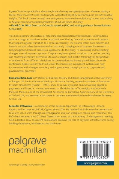 Chapter 1) Pre-1900 utopian visions of the 'cashless society'; Matthew Hollow.- Chapter 2) The Banknote: a Momentous Innovation; Yolanda Blasco-Martel and Carles Sudrià-Triay.- Chapter 3) Innovating means of payment in Chile, 1840s - 1860; César Ross.- Chapter 4) The Many Monies of King Cotton: Domestic and Foreign Currencies in New Orleans, 1856-1860; Manuel Alejandro Bautista González.- Chapter 5) The Art of Lending in the Pampas: Commercial Credit and Financial Intermediation in Argentina, 1900-1930; Andrea Lluch.- Chapter 6) Matching cash and kind: Argentina's experimentation with multiple currencies; Georgina M. Gomez.- Chapter 7) A South American Experience on Bartering: the case of Tradaq in Brazil; José E. Rivero.- Chapter 8) Dematerialization and the cashless society: a look backward, a look sideward; Patrice Baubeau.- Chapter 9) Origins of the Modern Concept of a Cashless Society, 1950s-1970s; Bernardo Bátiz-Lazo, Thomas Haigh and David L. Stearns.- Chapter 10) From Teleprocessing to Cashless Payment Technologies: "la Caixa" 1960-2015; J. Carles Maixé-Altés.- Chapter 11) Limits to cashless payments and the persistence of cash. Hypotheses about Mexico; Gustavo A Del Angel.- Chapter 12) The Cyprus Cash Crash: A Case of Collective Punishment; Leonidas Efthymiou and Sophia Michael.- Chapter 13) CajaVecina: The Bancarization of Chile through Corner Shops; Juan Felipe Espinosa Cristia and José Ignacio Alarcón Molina.- Chapter 14) Entrée: The Rocky Origins of Visa's Debit Card; Dave Stearns.- Chapter 15) Protecting Plastic: Credit Card Fraud in Historical Perspective; Vanatta H. Sean.- Chapter 16) Mondex, VisaCash: A First (Failed) Attempt at an Electronic Purse; Bernardo Bátiz-Lazo and Tony Moretta.- Chapter 17) The matter of payment; Joe Deville.- Chapter 18) The Russian Payments Scheme: Politics, Innovation and The Cash Problem; Daniel Gusev.- Chapter 19) Who holds credit cards and bank accounts in Uruguay? Evidence from Survey of Uruguayan Households; Graciela Sanroman and Guillermo Santos.- Chapter 20) Mobile banking in Africa: The current state of play; Marybeth Rouse and Verhoef Grietjie.- Chapter 21) Mobile Payment System in Turkey; Dalziel Nurdilek and Ali Avunduk Can.- Chapter 22) Electronic Payment System of Thailand: Mobile Banking Market Competition; Jarunee Wonglimpiyarat.- Chapter 23) The Determinants of Mobile Payment Adoption: An Intercultural Study; Uwe Hack.- Chapter 24) Can mobile money replace cash in India?; Lakshmi Kumar.- Chapter 25) A Gentle Introduction to Side Channel Attacks on Smartphones; Simon Laurent.- Chapter 26) Barriers and drivers to future bank adoption of mobile banking: A stakeholder perspective; Jennifer Mullan, Laura Bradley and Sharon Loane.- Chapter 27) European Payments: A Path towards the Single Market for Payments; Ruth Wandhofer.- Chapter 28) The Single Euro Payment Area (SEPA): Implementation in Spain; Santiago Carbo-Valverde and Francisco Rodríguez Fernández.- Chapter 29) Revolutionizing Cashless Payments in Mexico: the Case of Mimoni; Gabriel Manjarrez.- Chapter 30) The Future of Money; Anette Broløs.- Chapter 31) Payments as we know them are changing - ebarts the Social eCurrency: Tomorrow's Cash; Yasmine Arafa, Cornelia Boldyreff and Miriam Morris.- Conclusion: Milestones for a Global Cashless Economy; Bernardo Bátiz-Lazo, Leonidas Efthymiou and Sophia Michael.