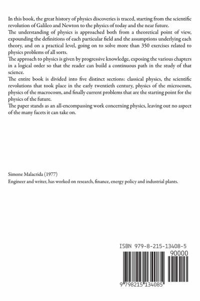 In this book, the great history of physics discoveries is traced, starting from the scientific revolution of Galileo and Newton to the physics of today and the near future. The understanding of physics is approached both from a theoretical point of view, expounding the definitions of each particular field and the assumptions underlying each theory, and on a practical level, going on to solve more than 350 exercises related to physics problems of all sorts. The approach to physics is given by progressive knowledge, exposing the various chapters in a logical order so that the reader can build a continuous path in the study of that science. The entire book is divided into five distinct sections: classical physics, the scientific revolutions that took place in the early twentieth century, physics of the microcosm, physics of the macrocosm, and finally current problems that are the starting point for the physics of the future. The paper stands as an all-encompassing work concerning physics, leaving out no aspect of the many facets it can take on.