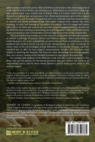 Jeffrey Cohen employs his poetic skill and biblical scholarship to the challenging task of rendering the Book of Psalms into rhymed verse. While there are several fine renderings into English blank verse, notably that of Robert Alter, it is Cohen's belief that it is the rhymed verse genre that can best convey the vibrant and passionate spirit of the original Hebrew poetry, and its innate lyricism that lent it, so naturally and from ancient times, to musical and choral accompaniment. This highly original work conveys the inner meaning, lyricism, and message of the psalms in a manner that will engage and inspire adherents of all faiths and none. It also provides a useful exegetical tool for all who use the Bible for study, teaching, or preaching, demystifying many words and phrases whose meaning translators and commentators acknowledge as uncertain in the original text. This is as much a commentary as a work of poetry, as testified to by the endorsements of several Cambridge University biblical and Hebrew scholars. Before proceeding to create his poetry, the writer consulted the ancient Greek and Latin translations, as well as medieval and modern Jewish and non-Jewish interpretations, in order to attempt to clarify many of the acknowledged textual difficulties in the psalms. In many cases this impelled him to offer his own original interpretations. Readers will find these most helpful in clarifying the thematic link between many succeeding lines and paragraphs that, on a cursory reading of the standard translations, may appear disconnected. For scholars and students of the Bible this work will offer a novel perspective. For those who use the psalms for devotional purposes, this new edition will serve as an inspirational source, and for those whose interest is purely in the poetry, there is also much to appeal.