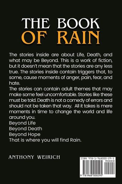 The stories inside are about Life, Death, and what may be Beyond. This is a work of fiction, but it doesn't mean that the stories are any less true. The stories inside contain triggers that, to some, cause moments of anger, pain, fear, and hate. The stories can contain adult themes that may make some feel uncomfortable. Stories like these must be told. Death is not a comedy of errors and should not be taken that way. All it takes is mere moments in time to change the world and life around you. Beyond Life Beyond Death Beyond Hope That is where you will find Rain.