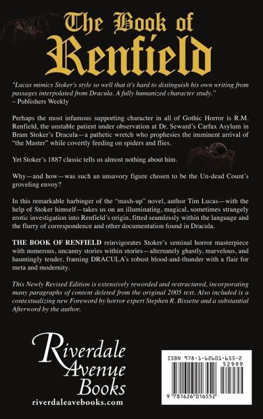 "Lucas mimics Stoker's style so well that it's hard to distinguish his own writing from passages interpolated from Dracula. A fully humanized character study." - Publishers Weekly Perhaps the most infamous supporting character in all of Gothic Horror is R.M. Renfield, the unstable patient under observation at Dr. Seward's Carfax Asylum in Bram Stoker's Dracula-a pathetic wretch who prophesies the imminent arrival of "the Master" while covertly feeding on spiders and flies. Yet Stoker's 1887 classic tells us almost nothing about him. Why-and how-was such an unsavory figure chosen to be the Un-dead Count's groveling envoy? In this remarkable harbinger of the "mash-up" novel, author Tim Lucas-with the help of Stoker himself-takes us on an illuminating, magical, sometimes strangely erotic investigation into Renfield's origin, fitted seamlessly within the language and the flurry of correspondence and other documentation found in Dracula. THE BOOK OF RENFIELD reinvigorates Stoker's seminal horror masterpiece with numerous, uncanny stories within stories-alternately ghastly, marvelous, and hauntingly tender, framing DRACULA's robust blood-and-thunder with a flair for meta and modernity. This Newly Revised Edition is extensively reworded and restructured, incorporating many paragraphs of content deleted from the original 2005 text. Also included is a contextualizing new Foreword by horror expert Stephen R. Bissette and a substantial Afterword by the author.