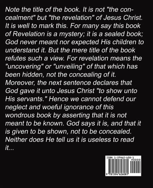 Note the title of the book. It is not "the concealment" but "the revelation" of Jesus Christ. It is well to mark this. For many say this book of Revelation is a mystery; it is a sealed book; God never meant nor expected His children to understand it. But the mere title of the book refutes such a view. For revelation means the "uncovering" or "unveiling" of that which has been hidden, not the concealing of it. Moreover, the next sentence declares that God gave it unto Jesus Christ "to show unto His servants." Hence we cannot defend our neglect and woeful ignorance of this wondrous book by asserting that it is not meant to be known. God says it is, and that it is given to be shown, not to be concealed. Neither does He tell us it is useless to read it...