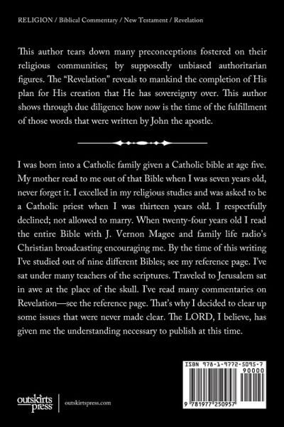 This author tears down many preconceptions fostered on their religious communities; by supposedly unbiased authoritarian figures. The "Revelation" reveals to mankind the completion of His plan for His creation that He has sovereignty over. This author shows through due diligence how now is the time of the fulfillment of those words that were written by John the apostle.