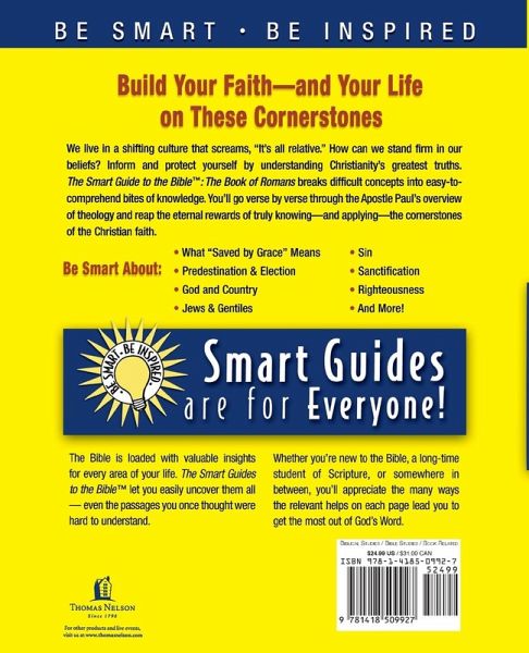 How can we stand firm in our beliefs in a culture that screams, "It's all relative."? Inform and protect yourself by understanding Christianity's greatest truths. The Smart Guide to the Bible: The Book of Romans breaks difficult concepts into easy-to-comprehend bites of knowledge. You'll go verse by verse through the Apostle Paul's overview of theology and reap the eternal rewards of truly knowing-and applying-the cornerstones of the Christian faith. The Smart Guide to the Bible series contains user-friendly guides for everyday Bible readers, designed to faithfully lead you through the Bible using an easy-to-understand approach. Every page contains handy features or learning aids like these: cross-references to other Scriptures brief commentaries from experts points to ponder the big picture of how passages fit with the entire Bible practical tips for applying biblical truths to life simple definitions of key words and concepts interesting maps, charts, and illustrations wrap-ups of each biblical passage study questions Whether you're new to the Bible, a long-time student of Scripture, or somewhere in between, you'll appreciate the many ways The Smart Guide to the Bible: The Book of Romans goes far beyond your typical Bible study tool. The practical, relevant helps on each page lead you to get the most out of God's word.