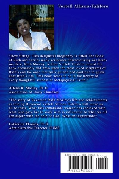 "How fitting! This delightful biography is titled The Book of Ruth and carries many scriptures characterizing our heroine diva, Ruth Mosley. Author Vertell Talifero named the book accurately and drew upon the most loved scriptures of Ruth's and the ones that truly guided and continue to guide dear Ruth's life. This book needs to be in the library of every thoughtful student of Metaphysical Truth." "The story of Reverend Ruth Mosley's life and achievements as told by Reverend Vertell Allison-Talifero will move us all to tears. What this remarkable woman has achieved with what God gave her to work with is influential to what we all can aspire with the help of God. What an inspiration!"