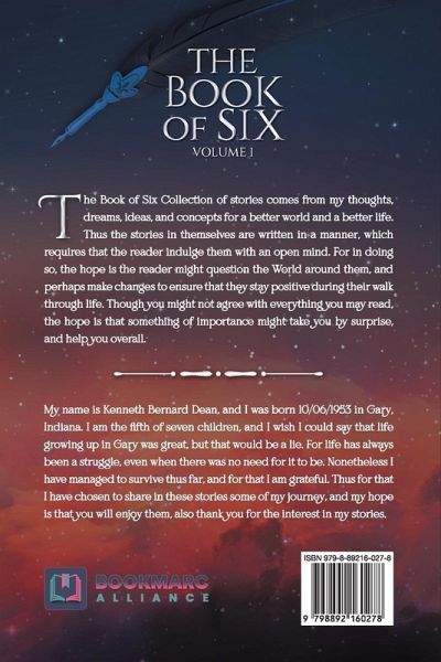 The Book of Six Collection of stories comes from my thoughts, dreams, ideas, and concepts for a better world and a better life. Thus the stories in themselves are written in a manner, which requires that the reader indulge them with an open mind. For in doing so, the hope is the reader might question the World around them, and perhaps make changes to ensure that they stay positive during their walk through life. Though you might not agree with everything you may read, the hope is that something of importance might take you by surprise, and help you overall.
