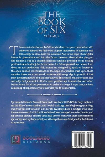 The Book of Six Collection of stories comes from my thoughts, dreams, ideas, and concepts for a better world and a better life. Thus the stories in themselves are written in a manner, which requires that the reader indulge them with an open mind. For in doing so, the hope is the reader might question the World around them, and perhaps make changes to ensure that they stay positive during their walk through life. Though you might not agree with everything you may read, the hope is that something of importance might take you by surprise, and help you overall.