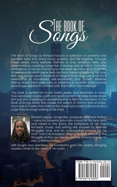 The Book of Songs by Rohsad Faraj is a collection of powerful and heartfelt lyrics that bring music, passion, and life together. Through these verses, Faraj explores themes of love, ambition, faith, and determination, creating songs full of energy and emotion. From the confidence of You're Charming to the deep devotion of To God, You Should Huddle, each piece feels real and meaningful. Mixing hip-hop, R&B, and spoken word, The Book of Songs is more than just lyrics; it's a celebration of movement, self-expression, and growth. Whether talking about hard work, love, or believing in yourself, Faraj's words encourage readers to connect with the rhythm and message. This book is perfect for music lovers, poets, and dreamers. It shows how words can inspire, uplift, and spark something deep inside. Music isn't just about hearing it's something that is felt from the heart. In The Book of Songs, every line carries the weight of rhythm and emotion. From love to hustle, from faith to fire, these lyrics aren't just words on a page they're songs waiting to be lived.