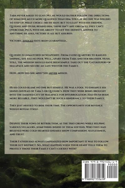 Taba never asked to lead. No, he would rather follow the directions of someone much more qualified than him. Still...if no one was willing to step up, what choice did he have but to lead? With his friends, Queenie and Hush, behind him, there isn't any obstacle they can't overcome. Plus, with his ability to get the definite answer to anything he asks, victory is all but assured. Victory...should have been guaranteed. Queenie is unmatched in weaponry. From close quarters to ranged sniping, she has no peer. Well...apart from Taba and her brother, Hush. Still, the mission should have been simple: take out the Gatekeepers of Malapace and secure an easy win for the Family. How...how did she miss? She never missed. Hush could blame no one but himself. He was a fool to enhance his senses instead of Taba's or Queenie's. Now they were being brought into the damned city of Malapace for interrogation. Had Hush been more reliable...they wouldn't be such a hindrance to their Family. They just needed to bide their time. The opportunity for revenge would reveal itself. Despite their vows of retribution, as the trio grows while helping various villagers...something inside of them softens. Who they had believed were cold-hearted enemies show compassion, selflessness, and trust. Their Father had always emphasized how important it was to follow their gut instinct. So...what happens when their heart tells them to protect those their Family can't coexist with?