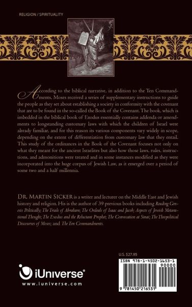 According to the biblical narrative, in addition to the Ten Commandments, Moses received a series of supplementary instructions to guide the people as they set about establishing a society in conformity with the covenant that are to be found in the so-called the Book of the Covenant. The book, which is imbedded in the biblical book of Exodus essentially contains addenda or amendments to longstanding customary laws with which the children of Israel were already familiar, and for this reason its various components vary widely in scope, depending on the extent of differentiation from customary law that they entail. This study of the ordinances in the Book of the Covenant focuses not only on what they meant for the ancient Israelites but also how those laws, rules, instructions, and admonitions were treated and in some instances modified as they were incorporated into the huge corpus of Jewish Law, as it emerged over a period of some two and a half millennia.