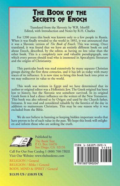 Translated from the Slavonic by W.R. Morfill. Edited, with Introduction and Notes by R.H. Charles For 1200 years this book was known only to a few people in Russia. When it was finally revealed to the world in 1892, it was announced that it was a Slavonic version of The Book of Enoch. This was wrong, Once translated, it was found that we have an entirely different book on and about Enoch, described, by the editor, as having no less value than the other book. This is a completely new and valuable pseudoepigraph, one which every person should read who is interested in Apocalyptic literature and the origins of Christianity. This particular book was read extensively by many separate Christian groups during the first three centuries, and it has left us today with many traces of its influence. It is now time to bring this book back into print so we may relearn its value to the world. This work was written in Egypt and we have determined that its author or original editor was a Hellenistic Jew. The Greek original has been lost to history, but the Slavonic text somehow survived. In its original Greek form it had a direct influence on the writers of the New Testament. This book was also referred to by Origen and used by the Church father, Irenaeus. It was read by, and considered valuable, by the heretics of the day in addition to mainstream Christians. This may be one reason why it was excluded from the Bible. We do not believe in banning or keeping hidden important works that have proven to be of such value in the past. We hope this book will enlighten and inform those who are seeking the truth.