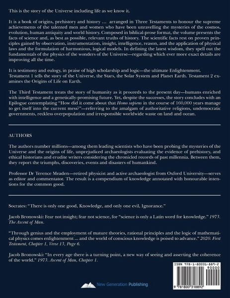This is the story of the Universe including life as we know it. It is a book of origins, prehistory and history ... arranged in Three Testaments to honour the supreme achievements of the talented men and women who have been unravelling the mysteries of the cosmos, evolution, human antiquity and world history. Composed in biblical-prose format, the volume presents the facts of science and, as best as possible, relevant truths of history. The scientific facts rest on proven principles gained by observation, instrumentation, insight, intelligence, reason, and the application of physical laws and the formulation of harmonious, logical models. In defining the latest wisdom, they spell out the fundamentals of the physics of the wonders of the Universe-regarding which ever more exact details are improving all the time. It is testimony and eulogy, in praise of high scholarship and logic-the ultimate Enlightenment. Testament 1 tells the story of the Universe, the Stars, the Solar System and Planet Earth. Testament 2 examines the Origins of Life on Earth. The Third Testament treats the story of humanity as it proceeds to the present day-humans enriched with intelligence and a genetically-promising future. Yet, despite the successes, the story concludes with an Epilogue contemplating "How did it come about that Homo sapiens in the course of 160,000 years manage to get itself into the current mess?"-referring to the amalgam of authoritative religions, undemocratic governments, reckless overpopulation and irresponsible worldwide waste on land and ocean. AUTHORS The authors number millions-among them leading scientists who have been probing the mysteries of the Universe and the origins of life, unprejudiced archaeologists evaluating the evidence of prehistory, and ethical historians and erudite writers considering the chronicled records of past millennia. Between them, they report the triumphs, discoveries, events and disasters of humankind. Professor Dr Terence Meaden-retired physicist and active archaeologist from Oxford University-serves as editor and commentator. The result is a compendium of knowledge annotated with honourable intentions for the common good. Socrates: "There is only one good, Knowledge, and only one evil, Ignorance." Jacob Bronowski: Fear not insight; fear not science, for "science is only a Latin word for knowledge." 1973. The Ascent of Man. "Through genius and the employment of mature theories, rational principles and the logic of mathematical physics comes enlightenment ... and the world of conscious knowledge is poised to advance." 2020. First Testament, Chapter 1, Verse 13, Page 6. Jacob Bronowski: "In every age there is a turning point, a new way of seeing and asserting the coherence of the world." 1973. Ascent of Man, Chapter 1.