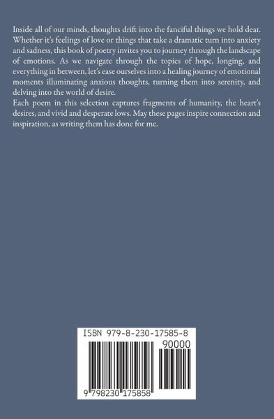 Inside all of our minds, our thoughts drift into the fanciful things we hold dear. Whether it's feelings of love or things that take a dramatic turn into anxiety and sadness, this book of poetry invites you to journey through the landscape of emotions. As we navigate through the topics of hope, longing, and everything in between, let's ease ourselves into a healing journey of emotional moments illuminating anxious thoughts, turning them into serenity, and delving into the world of desire. Each poem in this selection captures fragments of humanity, the heart's desires, and vivid and desperate lows. May these pages inspire connection and inspiration, as writing them has done for me.