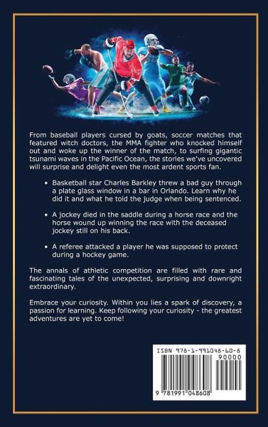 "Fascinating, well researched, and more than I expected! Five Stars!" So, you think you've heard every strange but true story from the wide world of sports, do you? Not so fast, sports fans. The annals of athletic competition are filled with tales of the unexpected, surprising, and downright extraordinary tales of sports. And we have some doozies for you along with some that are rare and fascinating. From baseball players cursed by goats, soccer matches that featured witch doctors, the MMA fighter who knocked himself out and woke up the winner of the match, to surfing gigantic tsunami waves in the Pacific Ocean, the stories we've uncovered will surprise and delight even the most ardent sports fan. Charles Barkley threw a bad guy through a plate glass window in a bar in Orlando. Learn why he did it and what he told the judge when being sentenced. A jockey died while in the saddle during a horse race and the horse wound up winning the race by a head length with the deceased jockey still on his back. A referee attacked a player he was supposed to protect during a hockey game. You will find the answers on these pages, intriguing stories and facts your friends won't believe, plus sports quizzes, and much more! So, get this book and find a comfy seat, grab some snacks, and get ready for a surprise or two by the fascinating, and unusual sports stories in this interesting book! This is the hardback black and white interior edition.