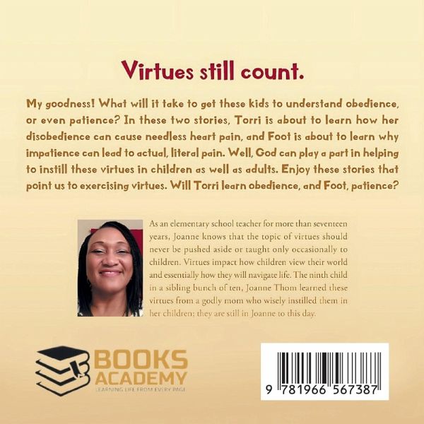 Virtues still count. My goodness! What will it take to get these kids to understand obedience or even patience? In these two stories, Torri is about to learn how her disobedience can cause needless heart pain, and Foot is about to learn why impatience can lead to actual, literal pain. Well, God can play a part in helping to instill these virtues in children as well as adults. Enjoy these stories that point us to exercising virtues. Will Torri learn obedience, and Foot, patience? As an elementary school teacher for more than seventeen years, Joanne knows that the topic of virtues should never be pushed aside or taught only occasionally to children. Virtues impact how children view their world and essentially how they will navigate life. The ninth child in a sibling bunch of ten, Joanne Thom learned these virtues from a godly mom who wisely instilled them in her children; they are still in Joanne to this day.
