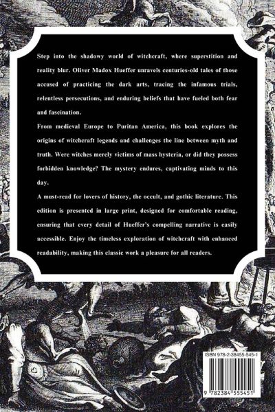 Step into the shadowy world of witchcraft, where superstition and reality blur. Oliver Madox Hueffer unravels centuries-old tales of those accused of practicing the dark arts, tracing the infamous trials, relentless persecutions, and enduring beliefs that have fueled both fear and fascination.From medieval Europe to Puritan America, this book explores the origins of witchcraft legends and challenges the line between myth and truth. Were witches merely victims of mass hysteria, or did they possess forbidden knowledge? The mystery endures, captivating minds to this day.A must-read for lovers of history, the occult, and gothic literature. This edition is presented in large print, designed for comfortable reading, ensuring that every detail of Hueffer's compelling narrative is easily accessible. Enjoy the timeless exploration of witchcraft with enhanced readability, making this classic work a pleasure for all readers.