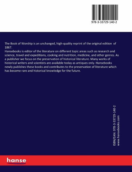 The Book of Worship is an unchanged, high-quality reprint of the original edition of 1867.Hansebooks is editor of the literature on different topic areas such as research and science, travel and expeditions, cooking and nutrition, medicine, and other genres. As a publisher we focus on the preservation of historical literature. Many works of historical writers and scientists are available today as antiques only. Hansebooks newly publishes these books and contributes to the preservation of literature which has become rare and historical knowledge for the future.