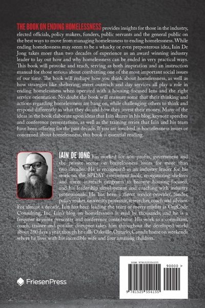The Book on Ending Homelessness provides insights for those in the industry, elected officials, policy makers, funders, public servants and the general public on the best ways to move from managing homelessness to ending homelessness. While ending homelessness may seem to be a whacky or even preposterous idea, Iain De Jong takes more than two decades of experience as an award winning industry leader to lay out how and why homelessness can be ended in very practical ways. This book will provoke and teach, serving as both inspiration and an instruction manual for those serious about combatting one of the most important social issues of our time. The book will reshape how you think about homelessness, as well as how strategies like sheltering, street outreach and day services all play a role in ending homelessness when operated with a housing-focused lens and the right service orientation. No doubt the book will reassure some that their thinking and actions regarding homelessness are bang on, while challenging others to think and respond differently in what they do and how they invest their money. Many of the ideas in the book elaborate upon ideas that Iain shares in his blog, keynote speeches and conference presentations, as well as the training series that Iain and his team have been offering for the past decade. If you are involved in homelessness issues or concerned about homelessness, this book is essential reading.