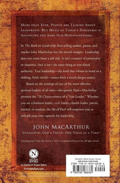 More than ever, people are talking about leadership. But much of today's discourse is advancing the same old misconceptions. In The Book on Leadership, best-selling author, pastor, and teacher John MacArthur sets the record straight: Leadership does not come from a job title. It isn't a matter of personality or charisma. And it isn't the same thing as iron-fisted authority. True leadership--the kind that refuses to bend to a shifting, fickle world--comes from a much deeper source. Based on the writings of one of the most effective spiritual leaders of all time--the apostle Paul--MacArthur presents the "26 Characteristics of a True Leader." Whether you are a business leader, civic leader, church leader, parent, teacher, or student, the life of Paul will empower you to unleash your own capacity for leadership.