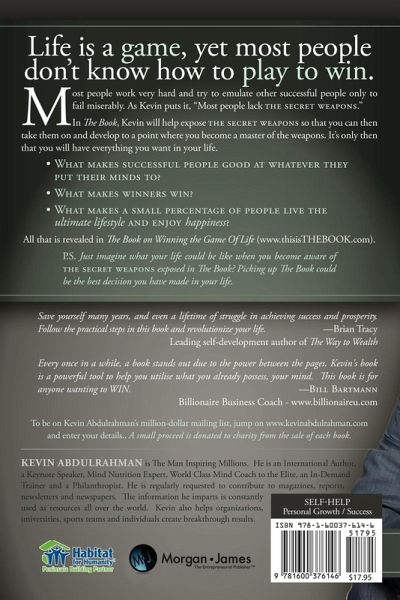 Life is a game, yet most people don't know how to play to win. Most people work very hard and try to emulate other successful people only to fail miserably. As Kevin puts it, "Most people lack the secret weapons." In The Book, Kevin will help expose the secret weapons so that you can then take them on and develop to a point where you become a master of the weapons. It's only then that you will have everything you want in your life. What makes successful people good at whatever they put their minds to? What makes winners win? What makes a small percentage of people live the ultimate lifestyle and enjoy happiness? All that is revealed in The Book on Winning the Game Of Life