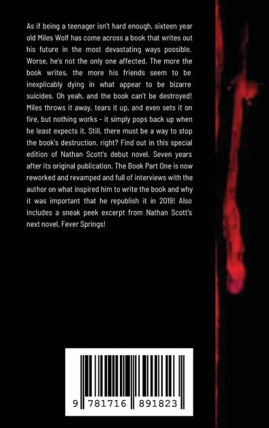 As if being a teenager isn't hard enough, sixteen year old Miles Wolf has come across a book that writes out his future in the most devastating ways possible. Worse, he's not the only one affected. The more the book writes, the more his friends seem to be inexplicably dying in what appear to be bizarre suicides. Oh yeah, and the book can't be destroyed! Miles throws it away, tears it up, and even sets it on fire, but nothing works - it simply pops back up when he least expects it. Still, there must be a way to stop the book's destruction, right? Find out in this special edition of Nathan Scott's debut novel. Seven years after its original publication, The Book Part One is now reworked and revamped and full of interviews with the author on what inspired him to write the book and why it was important that he republish it in 2019! Also includes a sneak peek excerpt from Nathan Scott's next novel, Fever Springs!