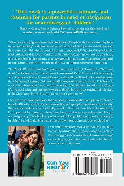 Lisa Bachman's son, Justin, was sick, suffering, and broken. Lisa and her husband, Ron, had no idea how to heal, help, or fix him. His third suicide attempt, by the time he was eleven years old, was their final wake-up call. Although he survived, their family was left without a roadmap. They would start down a path through a maze, hit a wall, turn around, and begin again. Thankfully, with help, they found their way. Not only did they get through extraordinarily difficult times with a suicidal son, but he went on to start a nationwide nonprofit organization and become a motivational speaker who led more that 150 full-school assemblies for students in grades five through twelve in sixteen states-all before he turned eighteen. Mental health problems and the subsequent intolerance and isolation are some of the most prevalent, yet least discussed issues facing parents and kids today. Children and teens are overscheduled, overstimulated, and dealing with challenges and questions that adults could never have imagined. Add in undiagnosed issues, willful ignorance, limited resources, refusal of the school to provide resources and abandonment from those believed to be a support system, and readers will get a glimpse of the obstacles the Bachman family had to overcome to navigate the first twelve years of their son's life. Bachman wrote The Book We Wish We Had to share her triumphs but even more so, to share her struggles. By revealing her vulnerabilities and missteps, her hope is that readers will relate and become better able to understand that their experiences and feelings are normal as they find their way out of their maze. The Book We Wish We Had addresses issues head-on with raw realism, humor, and hope as Bachman tells the story of how her family navigated their son Justin's suicide attempts, medical, and mental illness. More than a memoir, this book is a resource that speaks truth to the pain that is so difficult to voice and share. The Book We Wish We Had shares practical tools-like finding healthcare practitioners who see the child and not his/her (mis)diagnosis-and unconventional ones like learning to speak with your child in an entirely new way by using questions instead of statements. The book maps out the conversations the family had that taught their son to have with his siblings, other kids, and people in positions of authority. They show readers how they stood up for their needs and their son's as they came to realize that teachers and doctors are not all knowing and that it's important for parents to trust their hearts.