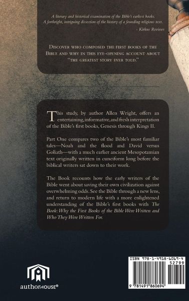 This study, by author Allen Wright, offers an entertaining, informative, and fresh interpretation of the Bible’s first books, Genesis through Kings II. Part One compares two of the Bible’s most familiar tales—Noah and the flood and David versus Goliath—with a much earlier ancient Mesopotamian text originally written in cuneiform long before the biblical writers sat down to their work. Part Two analyzes each book of Genesis through Kings II coupled with the historical backdrop of the times. Learning how the biblical writers set about their business can help you stir up healthy and entertaining discussions among believers and nonbelievers alike; learn about ancient times and the conditions under which the first books of the Bible were written; And discover the true intention of the Bible, as well as its original intended audience. The Book recounts how the early writers of the Bible went about saving their own civilization against overwhelming odds. See the Bible through a new lens, and return to modern life with a more enlightened understanding of the Bible’s first books with The Book: Why the First Books of the Bible Were Written and Who They Were Written For.