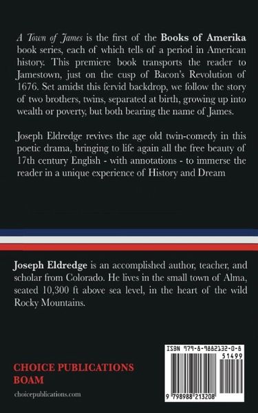 A Town of James is the first of the Books of Amerika book series, each of which tells of a unique period in American history. This premiere book transports the reader to Jamestown, just on the cusp of Bacon's Revolution of 1676. Set amidst this fervid backdrop, we follow the story of two brothers, twins, separated at birth, but both bearing the name of James. Joseph Eldredge revives the age old twin-comedy in this poetic drama, brining to life again all the free beauty of 17th century English - with annotations - to immerse the reader in a unique experience of History and Dream.