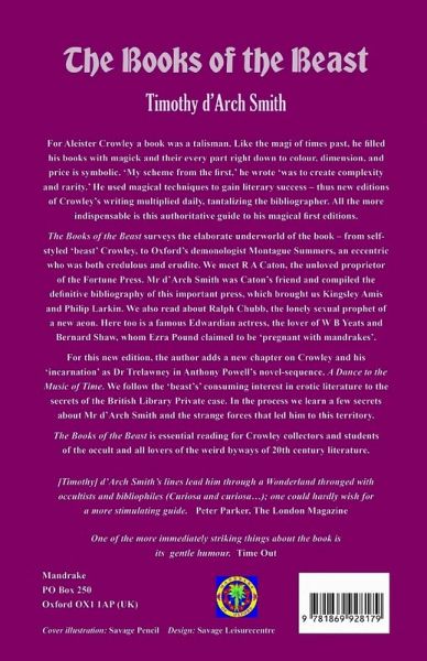 Timothy d'Arch Smith is a well-known bibliographer, reviewer and antiquarian bookseller with a special interest in the by-ways of literature, notably the occult and the curious. For Aleister Crowley a book was a talisman and their every part right down to colour, dimension, and price was symbolic. He also used magical techniques to gain literary success--thus new editions of Crowley's writing multiply daily, tantalizing the bibliographer. All the more indispensable is this authoritative guide to his magical first editions. Timothy d'Arch Smith, widely acknowledged as a leading expert on Crowley and on underground literature, offers several shorter articles on: *Oxford's demonologist Montague Summers; *R A Caton and his Fortune Press; *Sexual prophet Ralph Chubb; *Florence Farr; *The British Library Private Case; *and Timothy d'Arch Smith. *For this new edition, he also adds an extra chapter on Crowley. ''...one could hardly wish for a more stimulating guide...'' -The London Magazine ''One of the more immediately striking things about the book is its gentle humour.'' - Time Out