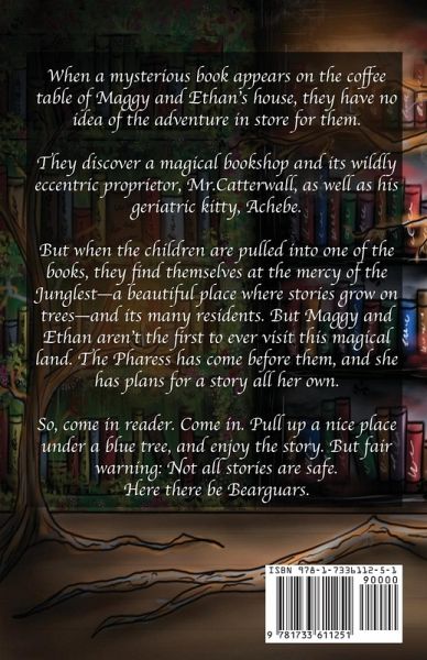 When a mysterious book appears on the coffee table of Maggy and Ethan's house, they have no idea of the adventure in store for them. They discover a magical bookshop and its wildly eccentric proprietor, Mr.Catterwall, as well as his geriatric kitty, Achebe. But when the children are pulled into one of the books, they find themselves at the mercy of the Junglest-a beautiful place where stories grow on trees-and its many residents. But Maggy and Ethan aren't the first to ever visit this magical land. The Pharess has come before them, and she has plans for a story all her own. So, come in reader. Come in. Pull up a nice place under a blue tree, and enjoy the story. But fair warning: Not all stories are safe. Here there be Bearguars.