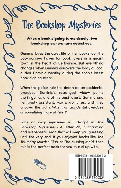 When a book signing turns deadly, two bookshop owners turn detectives. Gemma loves the quiet life of her bookshop, the Bookworm-a haven for book lovers in a quaint town in the heart of Derbyshire. But everything changes when Gemma discovers the body of local author Dominic Westley during the shop's latest book signing event. When the police rule the death as an accidental overdose, Dominic's estranged widow points the finger at one of his past lovers. Gemma and her trusty assistant, Mavis, won't rest until they uncover the truth. Was it an accidental overdose or something more sinister? Fans of cozy mysteries will delight in The Bookshop Mysteries - A Bitter Pill, a charming and suspenseful read that will keep you guessing until the very end. If you enjoyed books like The Thursday Murder Club or The Missing Maid, then this is the perfect book for you to curl up with.
