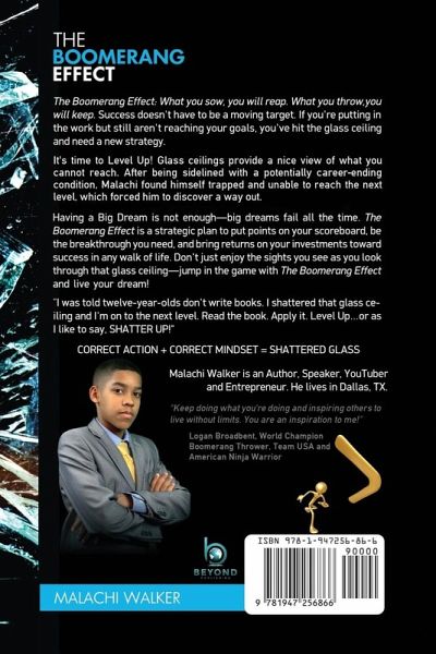 It's time to Level Up! Glass ceilings provide a nice view of what you cannot reach. In his book, Malachi gives you the weapons you need so you can shatter the glass that keeps holding you back. Having a Big Dream is not enough-big dreams fail all the time. The Boomerang Effect is a strategic plan to put points on your scoreboard, be the breakthrough you need, and bring returns on your investments toward success in any walk of life. Don't just enjoy the sights you see as you look through that glass ceiling-jump in the game with The Boomerang Effect and live your dream! "I was told twelve-year-olds don't write books. I shattered that glass ceiling and I'm on to the next level. Read the book. Apply it. Level Up…or as I like to say, SHATTER UP!" CORRECT ACTION + CORRECT MINDSET = SHATTERED GLASS Isn't it time you shatter some glass and go to the next level? You need this book-stop being contained. The Boomerang Effect gives you realistic ways of thinking and doing that will cause you to reap successful results! Malachi's method of communication clicks. This book also has Boomerang-To-Success Tips, Group Discussion Questions, Mindset Success Stories and RealLife Application. A quick read. An easy read. A shatter-your-glass-ceiling read! Get it on your device & in your hands. Clint Gresham, Seattle Seahawks Super Bowl XLVIII, International Speaker and BestSelling Author of Becoming: "Malachi has practically broken down these timeless principles into actionable steps to help anyone…and I mean ANYONE, get back up when they get knocked down…I know that if you will apply these principles, the "Boomerang Effect" will serve you well throughout your life."