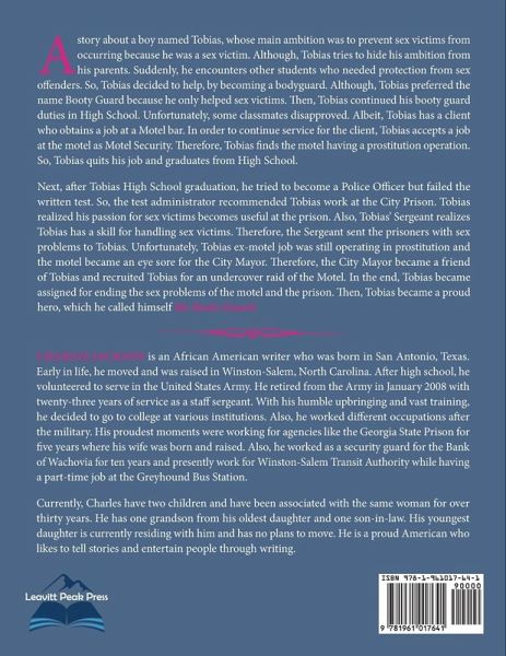 A story about a boy named Tobias, whose main ambition was to prevent sex victims from occurring because he was a sex victim. Although, Tobias tries to hide his ambition from his parents. Suddenly, he encounters other students who needed protection from sex offenders. So, Tobias decided to help, by becoming a bodyguard. Although, Tobias preferred the name Booty Guard because he only helped sex victims. Then, Tobias continued his booty guard duties in High School. Unfortunately, some classmates disapproved. Albeit, Tobias has a client who obtains a job at a Motel bar. In order to continue service for the client, Tobias accepts a job at the motel as Motel Security. Therefore, Tobias finds the motel having a prostitution operation. So, Tobias quits his job and graduates from High School.Next, after Tobias High School graduation, he tried to become a Police Officer but failed the written test. So, the test administrator recommended Tobias work at the City Prison. Tobias realized his passion for sex victims becomes useful at the prison. Also, Tobias' Sergeant realizes Tobias has a skill for handling sex victims. Therefore, the Sergeant sent the prisoners with sex problems to Tobias. Unfortunately, Tobias ex-motel job was still operating in prostitution and the motel became an eye sore for the City Mayor. Therefore, the City Mayor became a friend of Tobias and recruited Tobias for an undercover raid of the Motel. In the end, Tobias became assigned for ending the sex problems of the motel and the prison. Then, Tobias became a proud hero, which he called himself the Booty Guard.