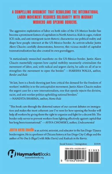 The aggressive exploitation of labor on both sides of the US-Mexico border has become a prominent feature of capitalism in North America. Kids in cages, violent ICE raids, and anti-immigrant racist rhetoric characterize our political reality and are everyday shaping how people intersect at the US-Mexico border. As activist-scholar Justin Akers Chacón carefully demonstrates, however, this vicious model of capitalist transnationalization has also created its own grave-diggers. Contemporary North American capitalism relies heavily on an inter-connected working class which extends across the border. Cross-border production and supply chains, logistics networks, and retail and service firms have aligned and fused a growing number of workers into one common class, whether they live in the US or Mexico. While money moves without restriction, the movement of displaced migrant workers across borders is restricted and punished. Transborder people face walls, armed agents, detention camps, and a growing regime of repressive laws that criminalize them. Despite the growth and violence of the police state dedicated to the repression of transborder populations-the migra-state-migrant workers have been at the forefront of class struggle in the United States. This timely book persuasively argues that labor and migrant solidarity movements are already showing how and why, in order to fight for justice and re-build the international union movement, we must open the border.